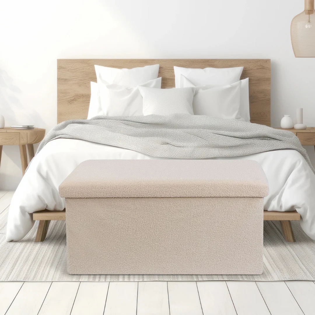 Large Teddy Boucle Fabric Ottoman Storage Box Bench Stool Foldable Chest Cream